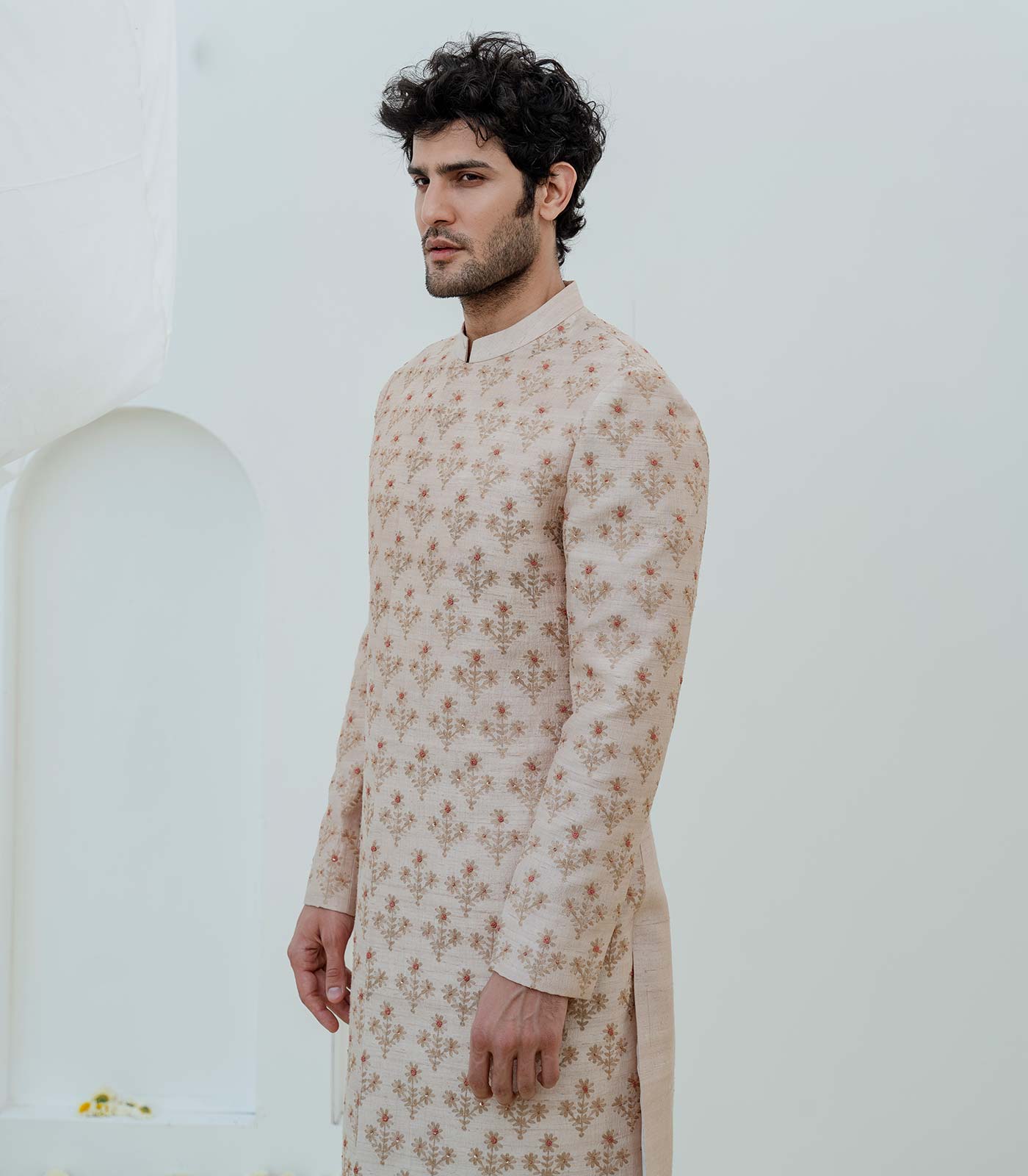Nude falling raw silk classic achkan sherwani with all-over aari thread embroidery nude gold satin linen trouser