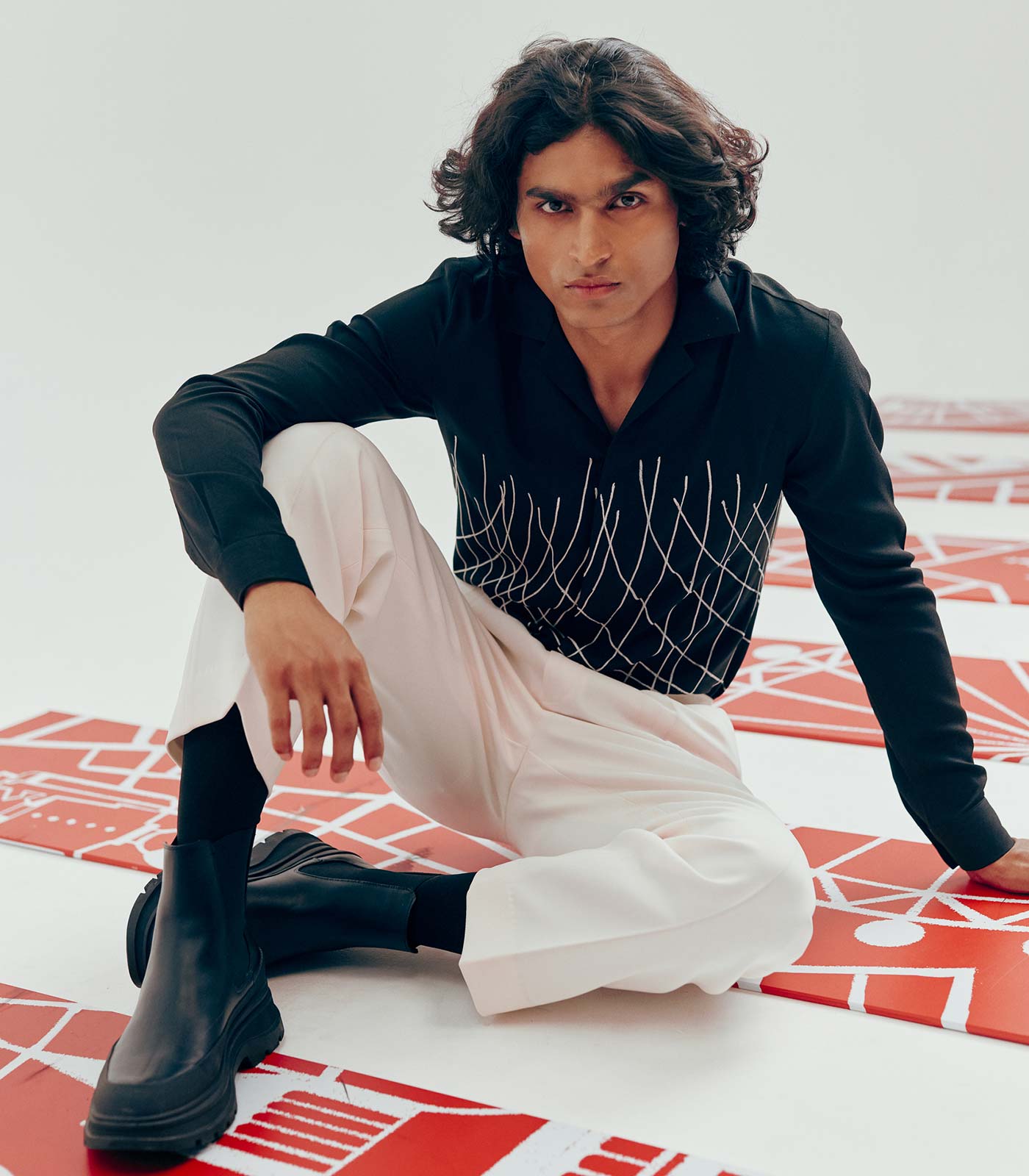 Black full sleeve placement embroidered shirt with cuban collar.