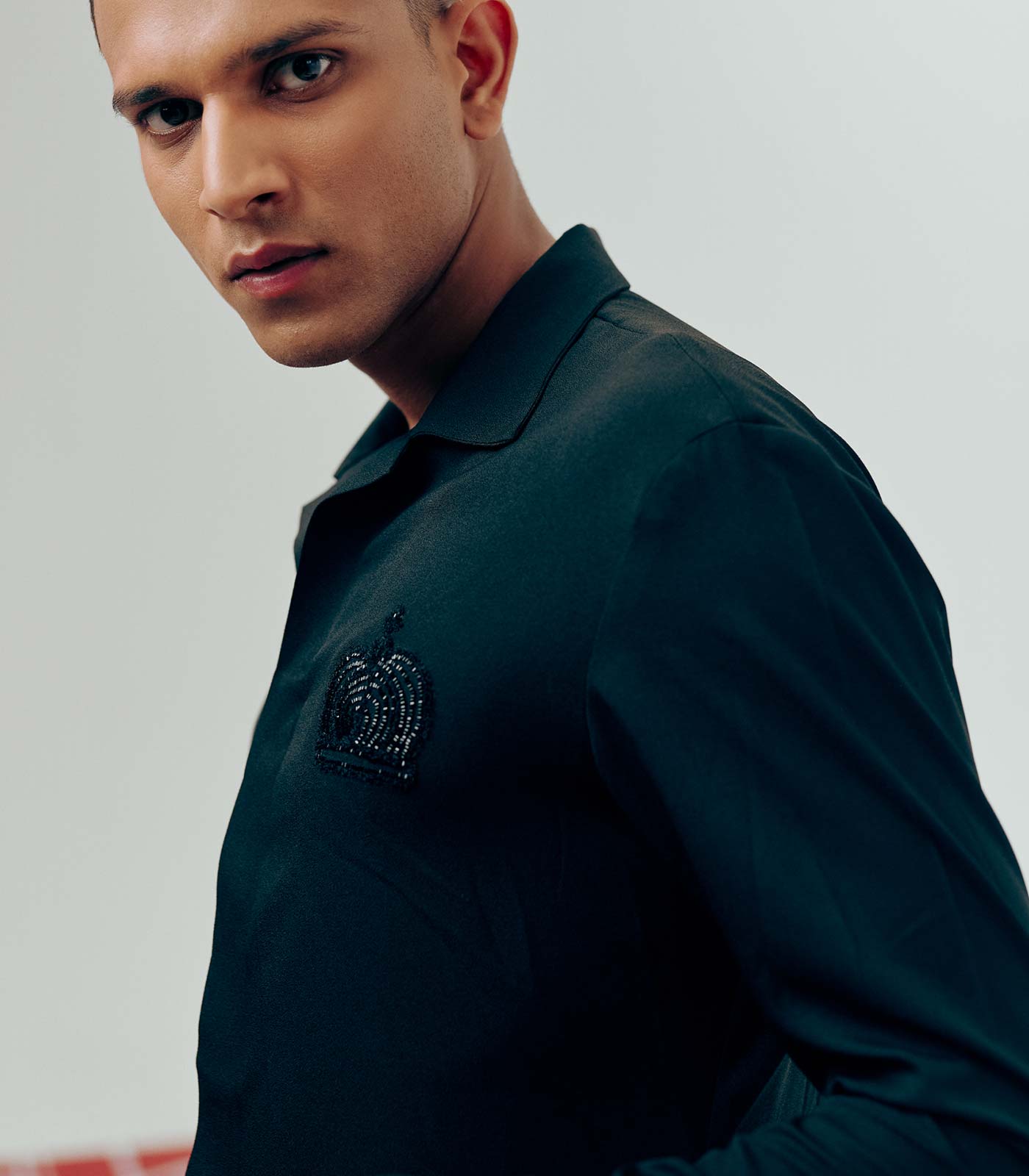 Black Full Sleeve Placement- Embroidered Shirt with a Cuban collar.