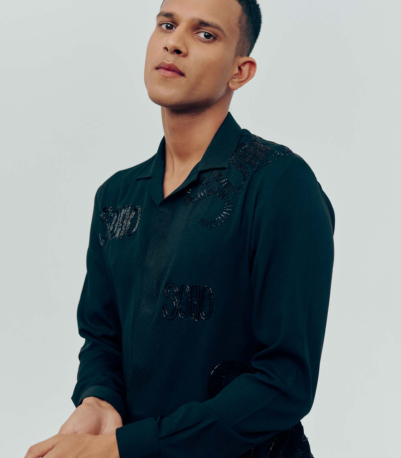 Black Full Sleeve Placement- Embroidered Shirt with a Cuban collar.