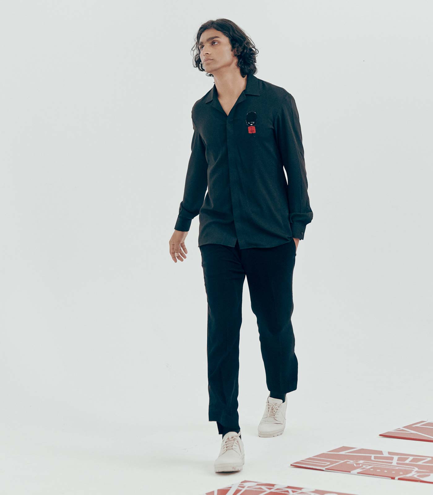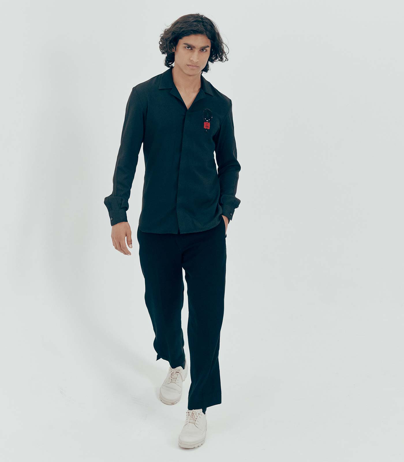 Black Full Sleeve Placement- Embroidered Shirt with a Cuban collar.