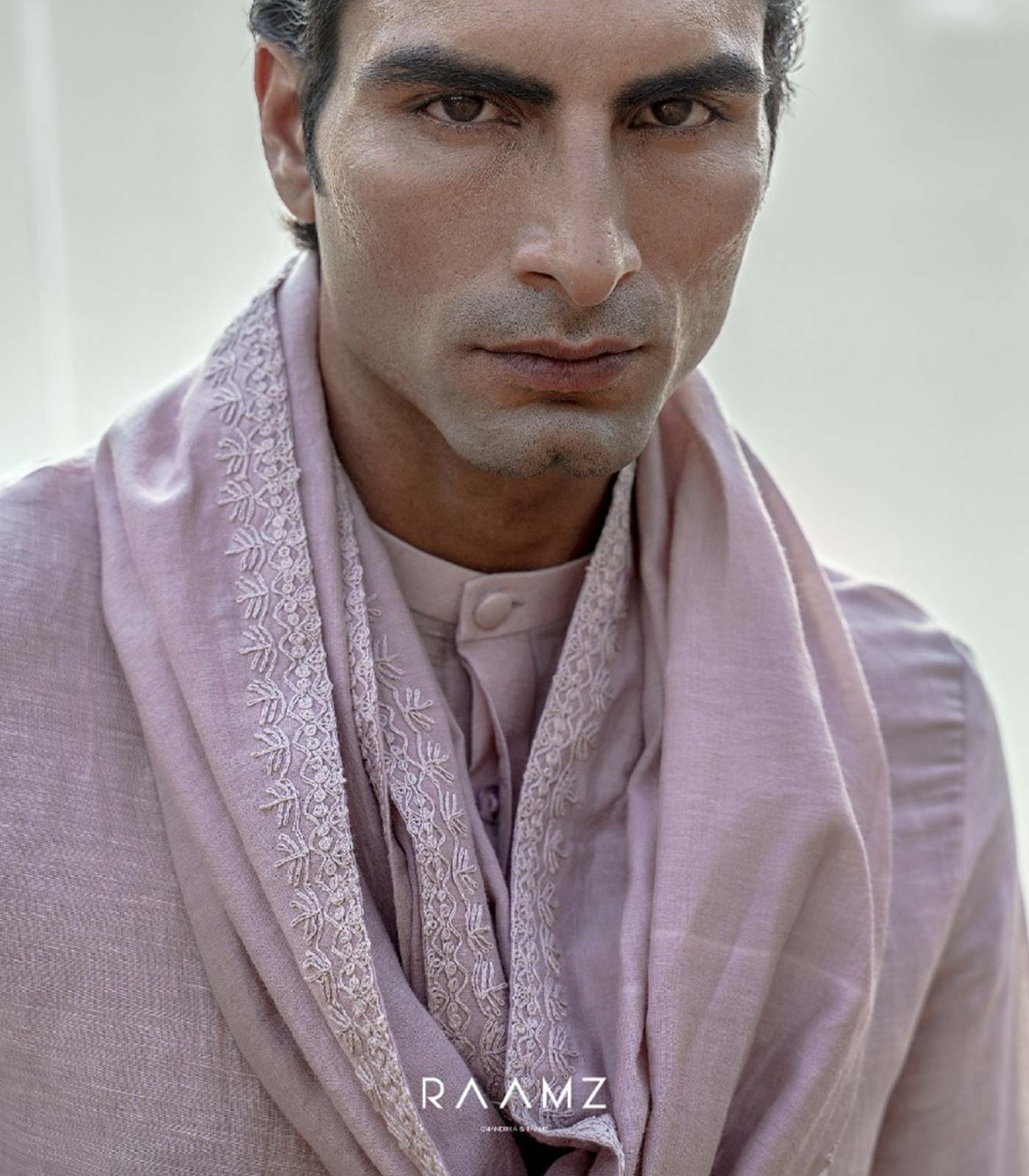 Light lavender satin linen chinese collar conceal placket apple cut shirt light lavender satin linen trouser light lavender mul cotton thar embroidered stole