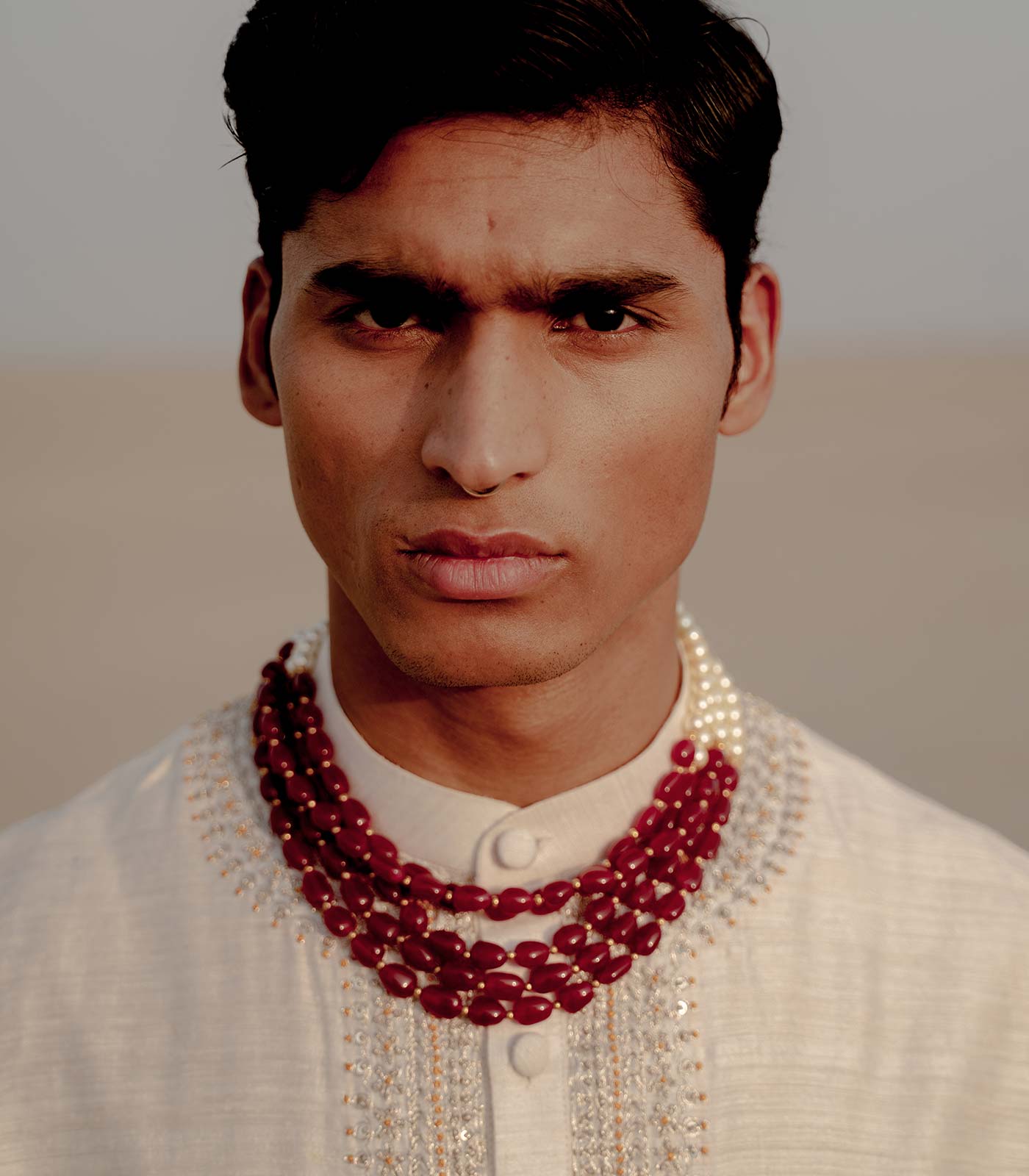 Ivory katan matka classic straight hem kurta with thar embroidery around the collar, placket, and sleeve hem ivory tusshar staple classic dhoti with zari open button-hole stitch