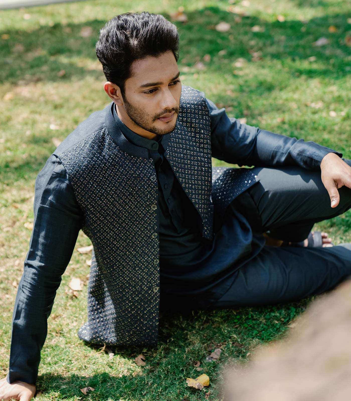 Midnight blue tusshar silk classic nehru jacket with apple cut hem and aari all-over buta embroidery midnight blue silk chanderi classic short kurta with apple cut hem midnight blue tusshar silk trouser