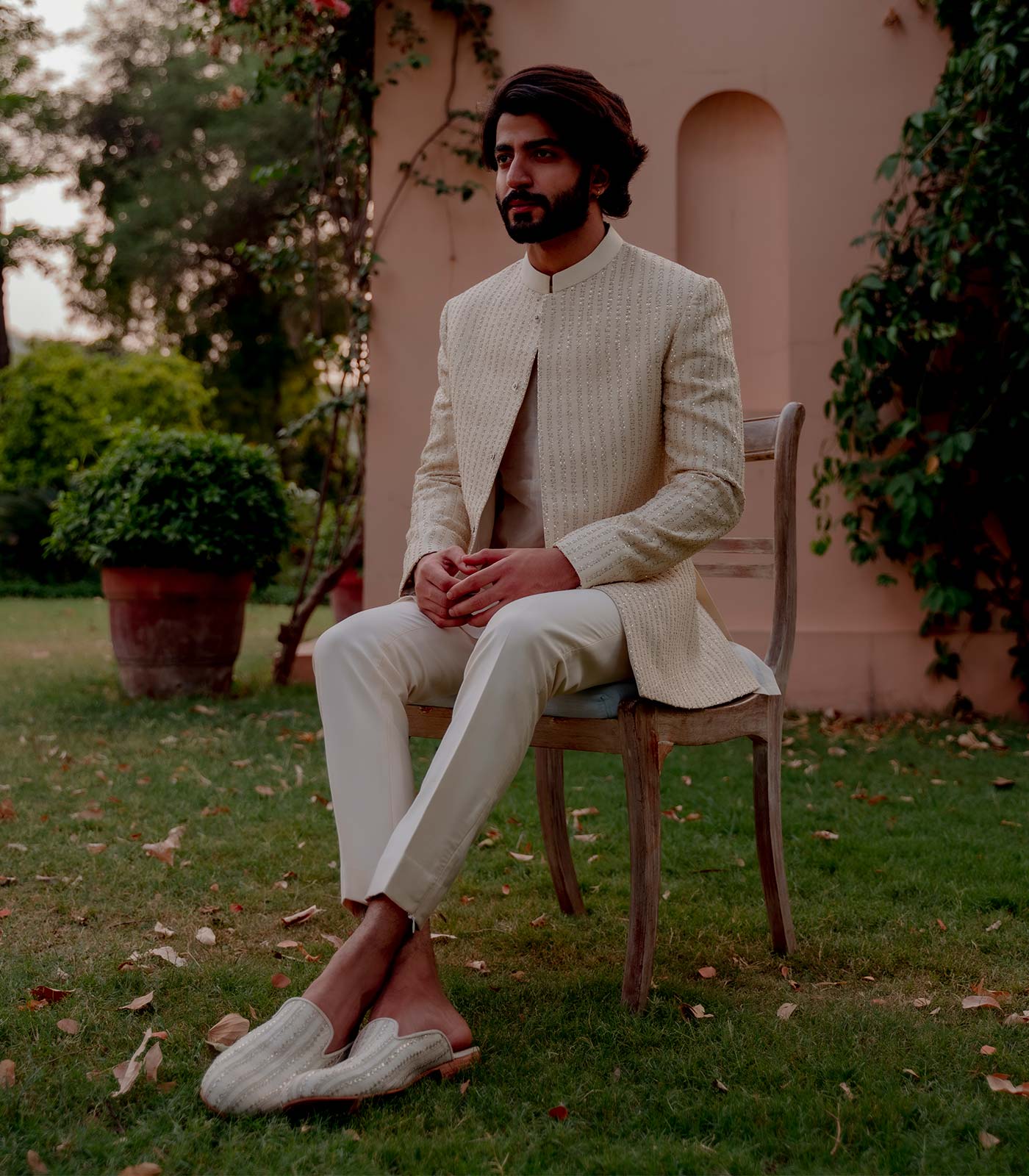 Ivory mulberry silk classic jodhpuri with all-over vertical lines aari embroidery ivory silk chanderi mid-thigh length straight hem kurta ivory italian trouser