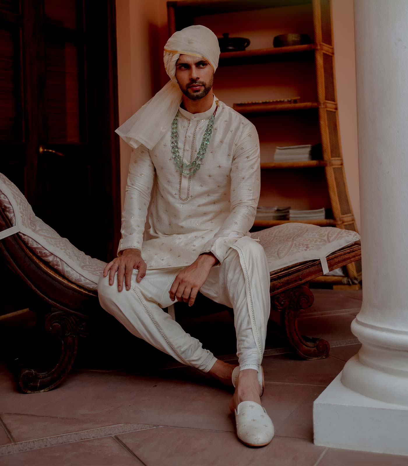 Ivory katan matka classic sherwani with badla embroidery beside the plackets, bottom and sleeve hem, and small aari all-over buta embroidery ivory silk chanderi classic straight hem kurta ivory tusshar staple step dhoti with hem embroidery ivory silk chanderi dori embroidered stole