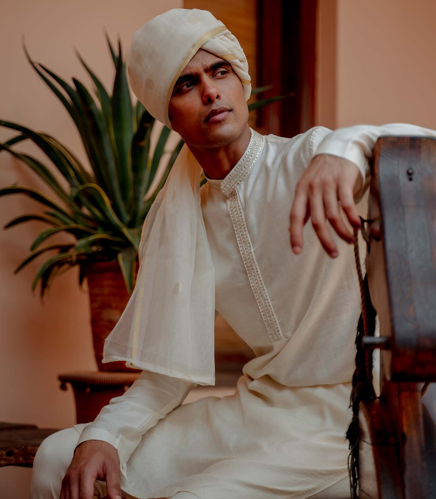 Ivory spun silk classic straight kurta with pitta embroidery on collar and conceal placket ivory italian trouser
