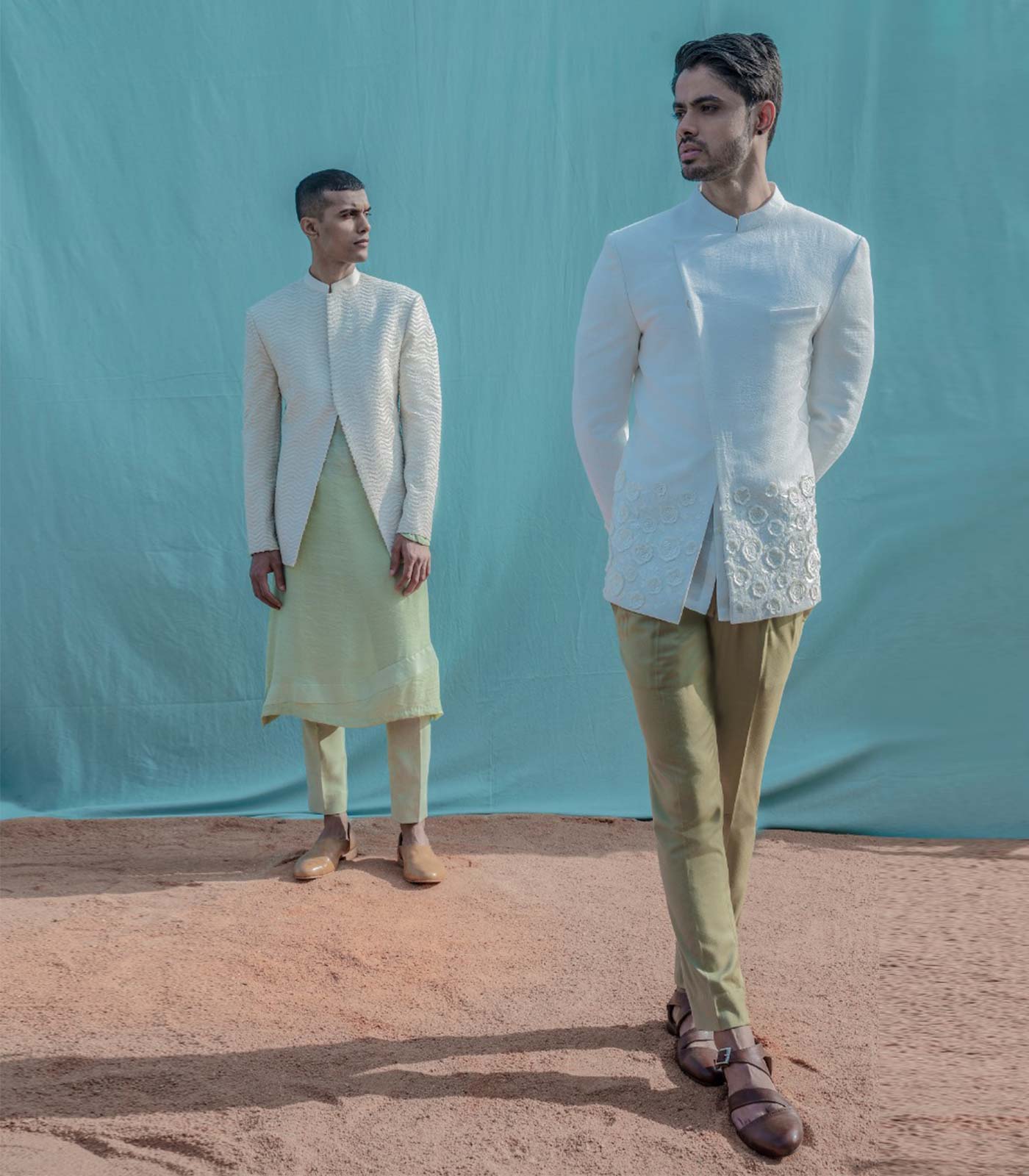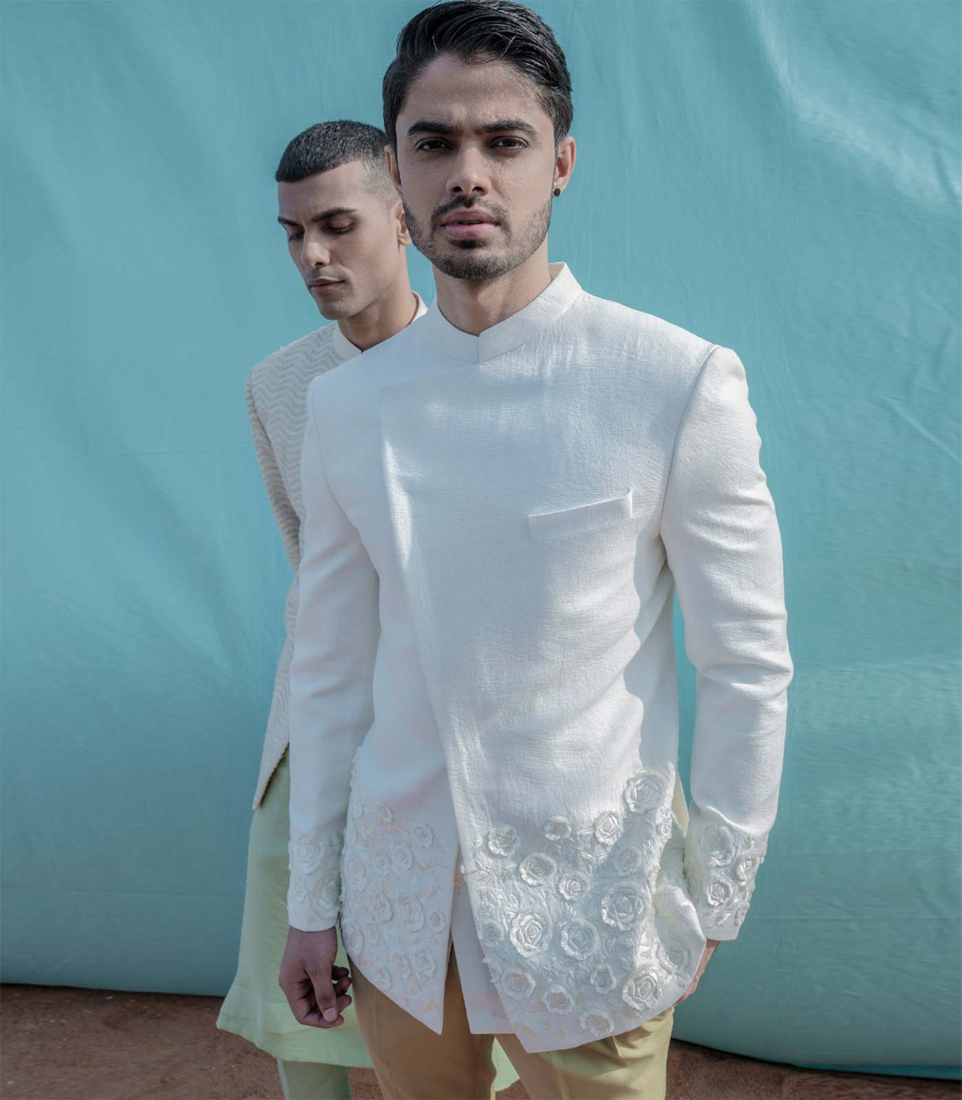 White cross placket jodhpuri with floral thread embroidery and Italian trouser