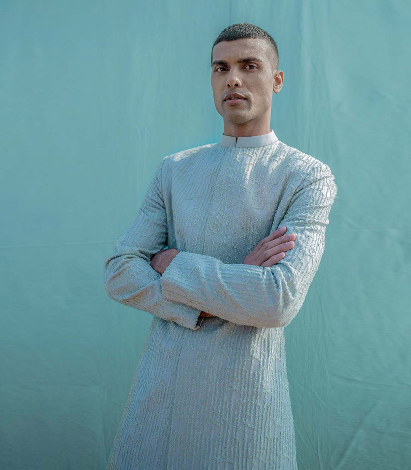 Light moss italian fab indo-western with zari and thread all-over embroidery desert sand italian trouser