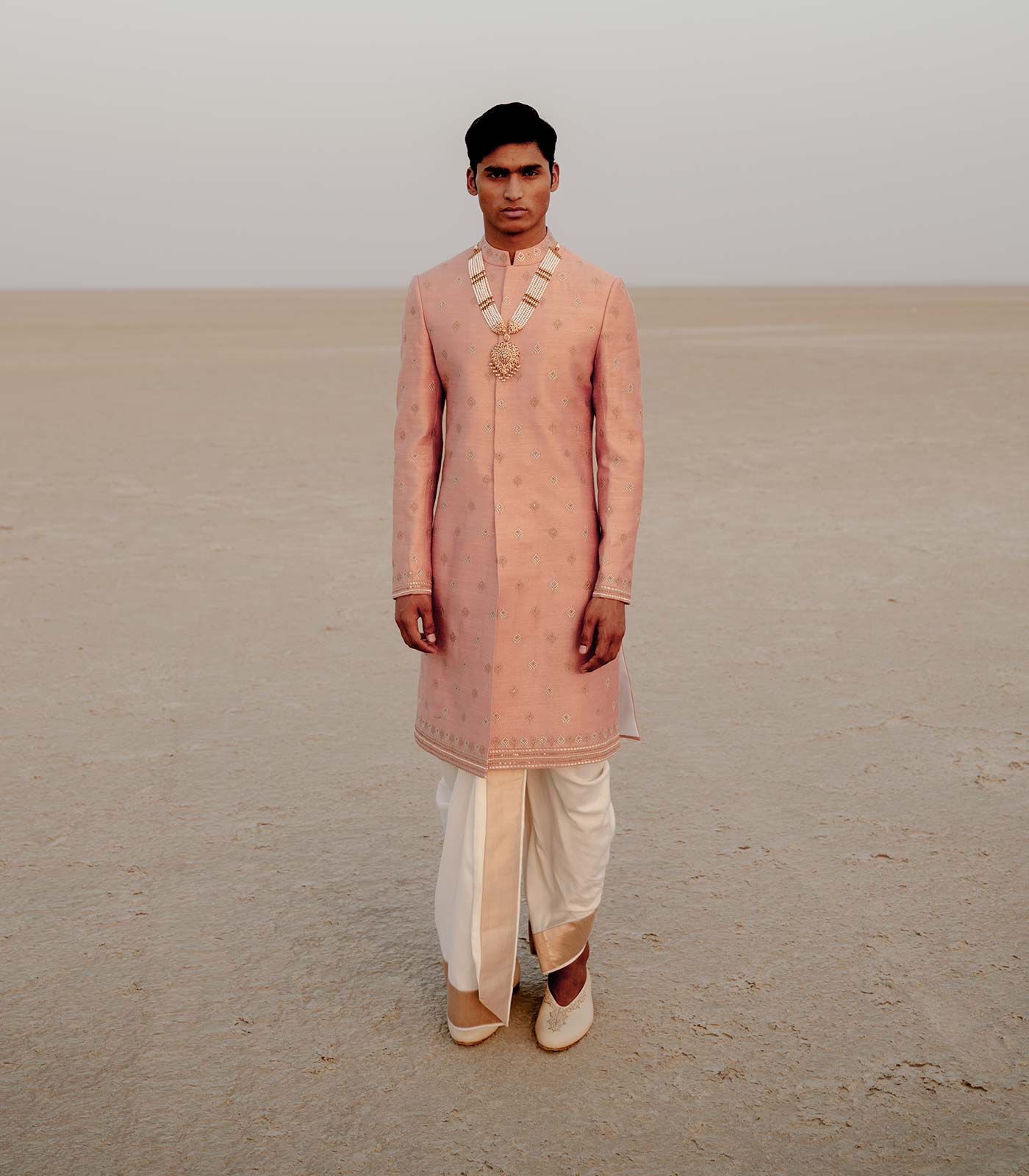 Rose gold katan matka sherwani with zari embroidery on collar, sleeve and bottom hem and zari all-over buta embroidery ivory tusshar staple classic dhoti with three inch gold boarder and kanduva