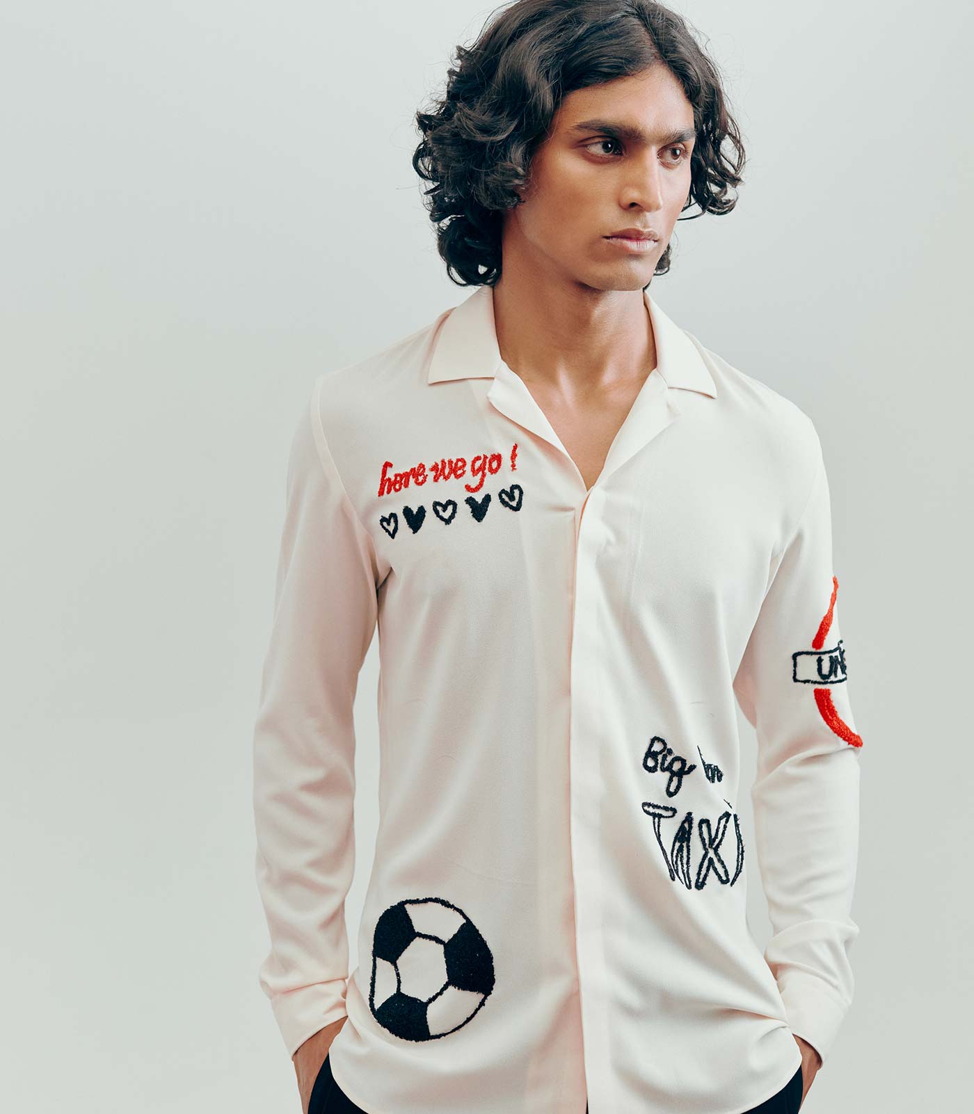 Off White full sleeve placement embroidered shirt with cuban collar.