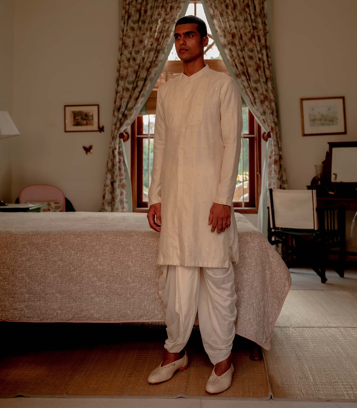 Ivory spun silk front full open conceal placket straight hem kurta with yoke aari all-over embroidery ivory tusshar staple classic dhoti with zari open button hole stitch embroidery