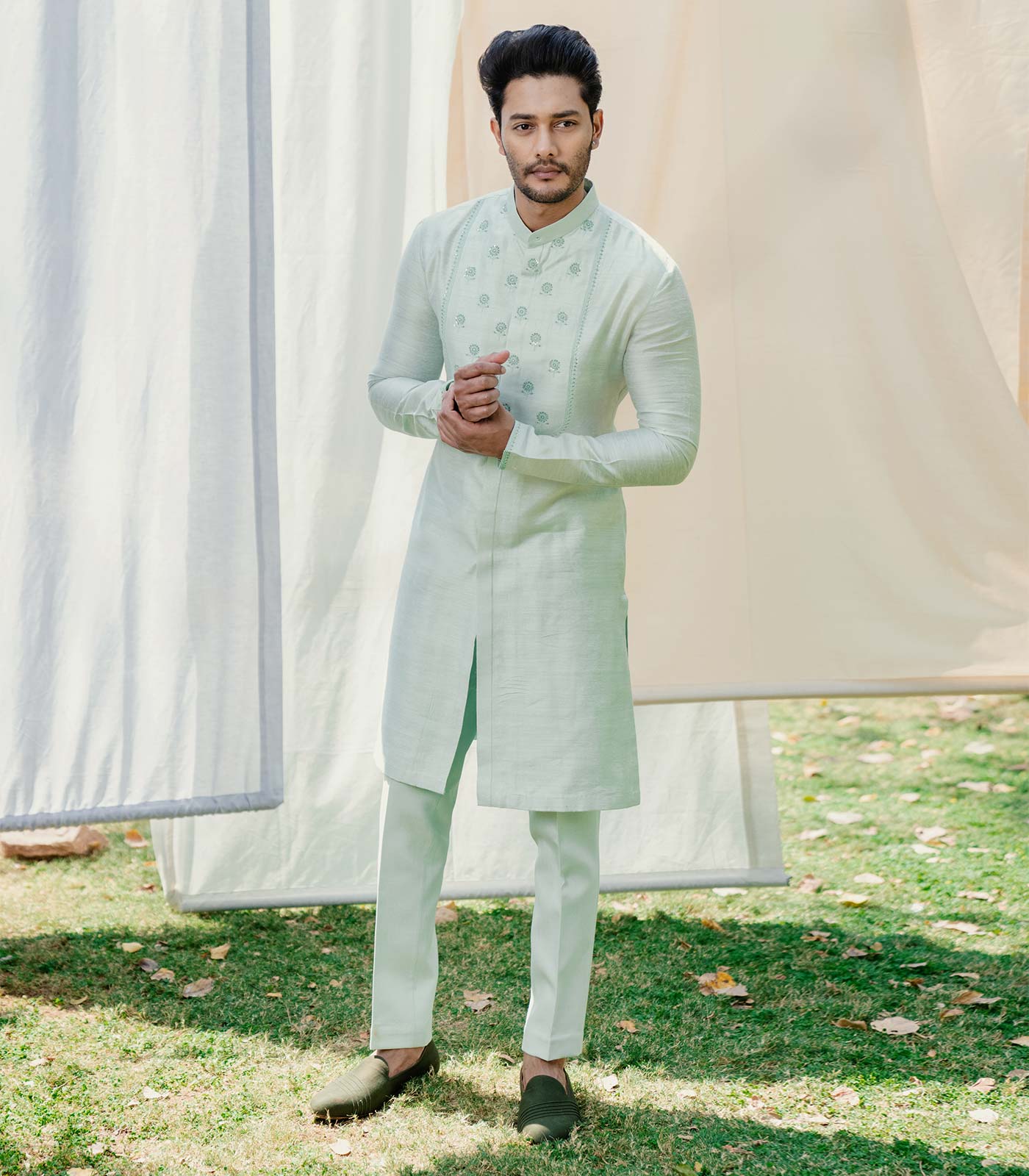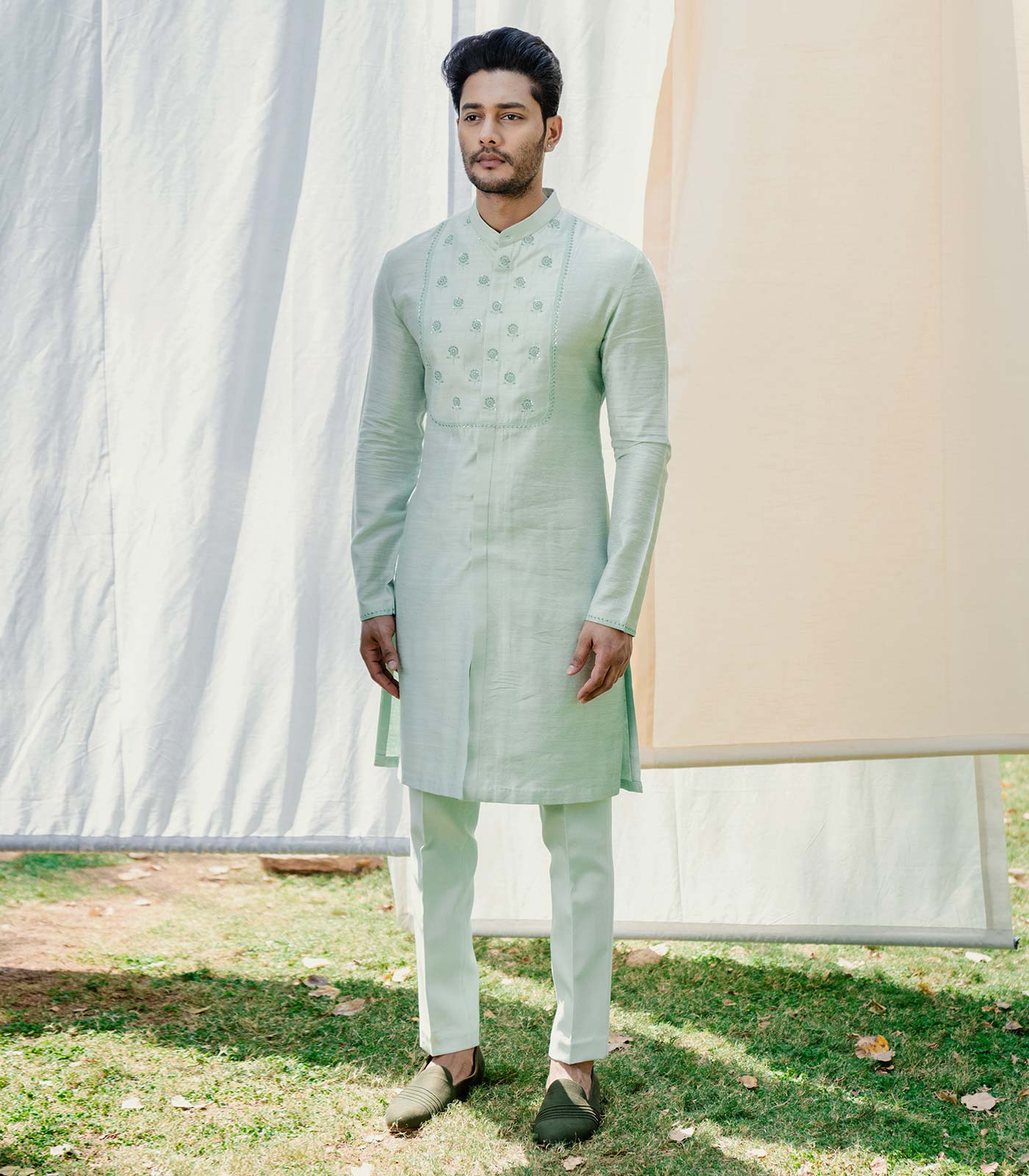 Oyster bay tusshar matka full open front conceal placket yoke and sleeve hem thread embroidered straight hem kurta oyster bay cotton lycra puna pant