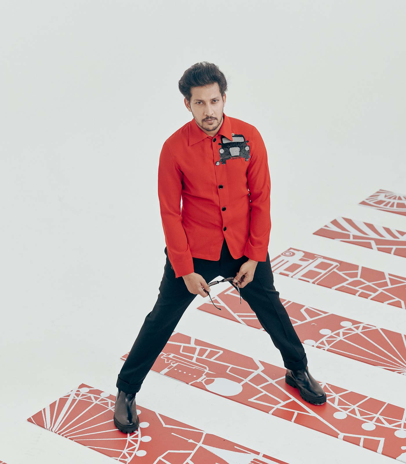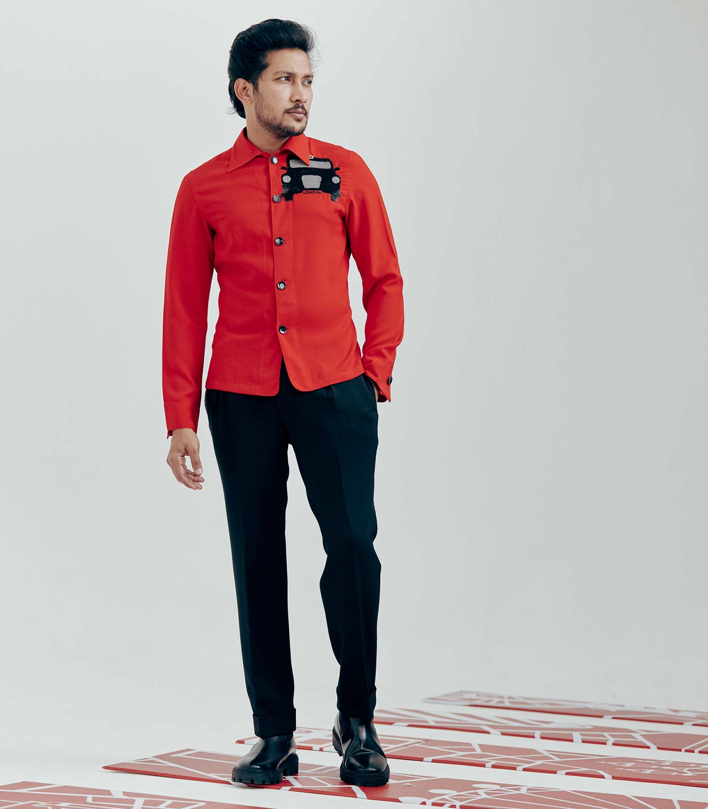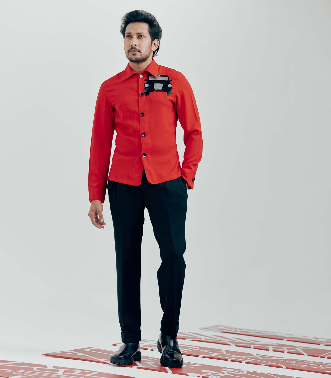 Red Full Sleeve Placement- Embroidered Shirt with a Cuban collar.