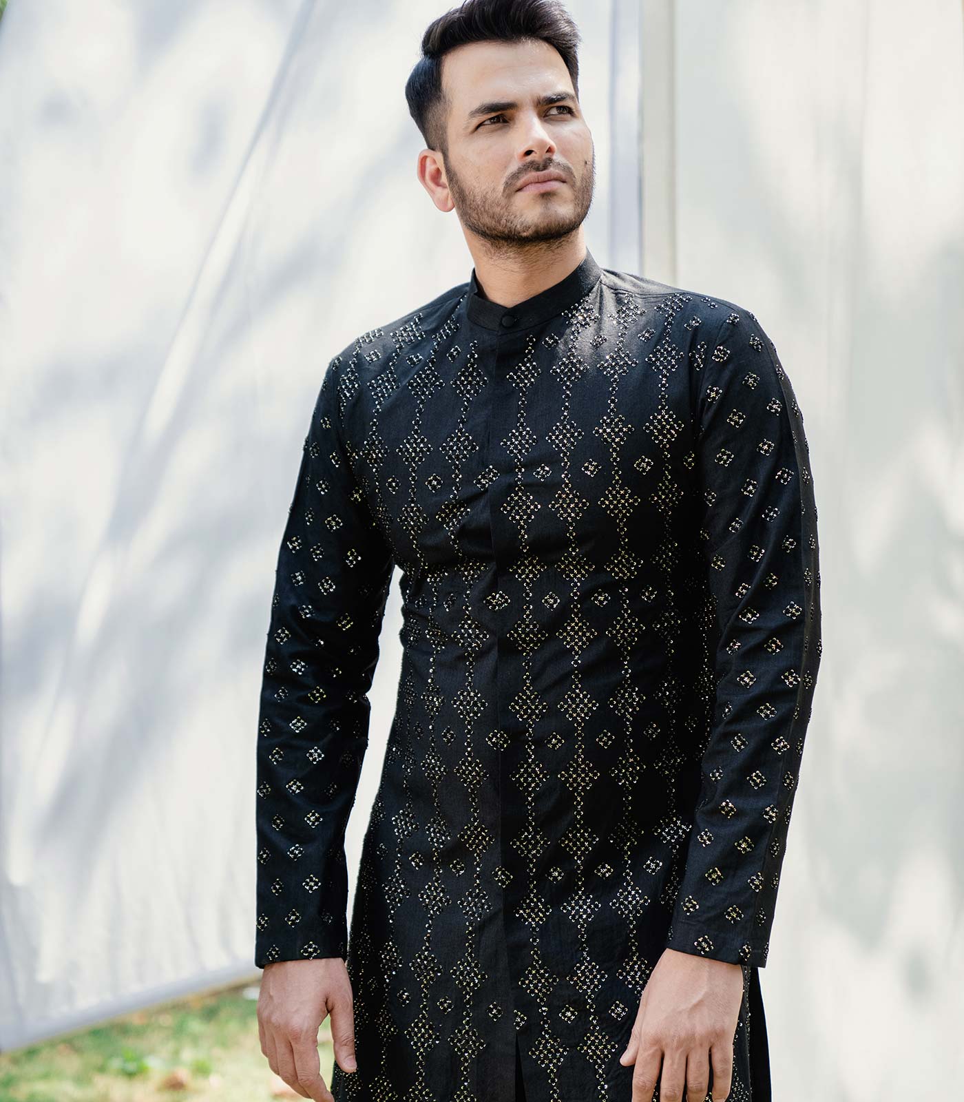 Black tusshar silk full open front conceal placket straight hem kurta with aari all-over embroidery black tusshar silk trouser