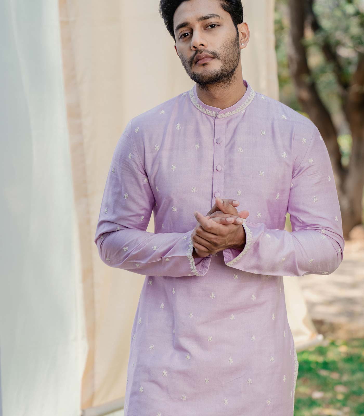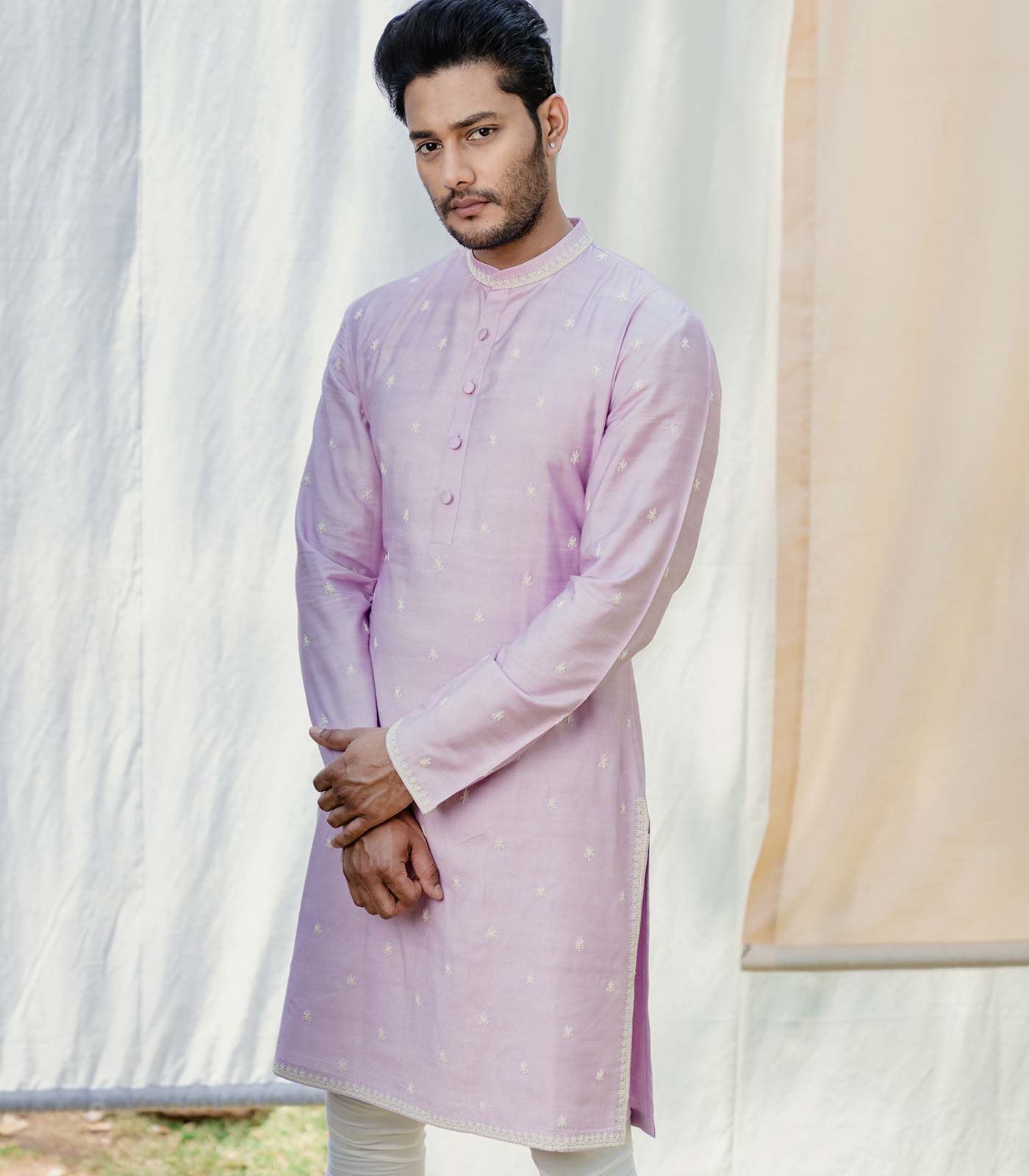 Lilac tusshar silk classic straight hem kurta with off-white all-over dori embroidery off-white cotton lycra chudidar bottom