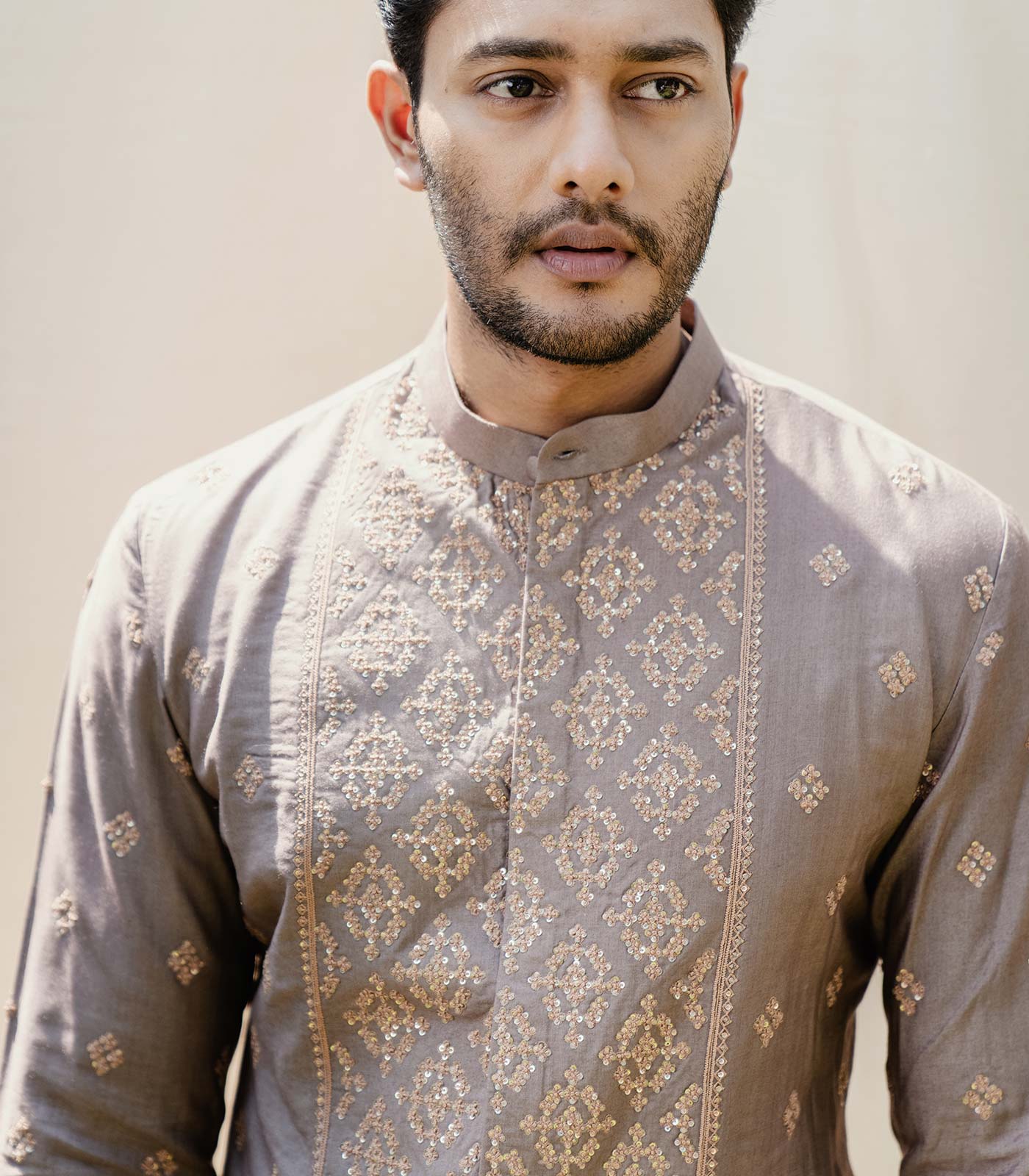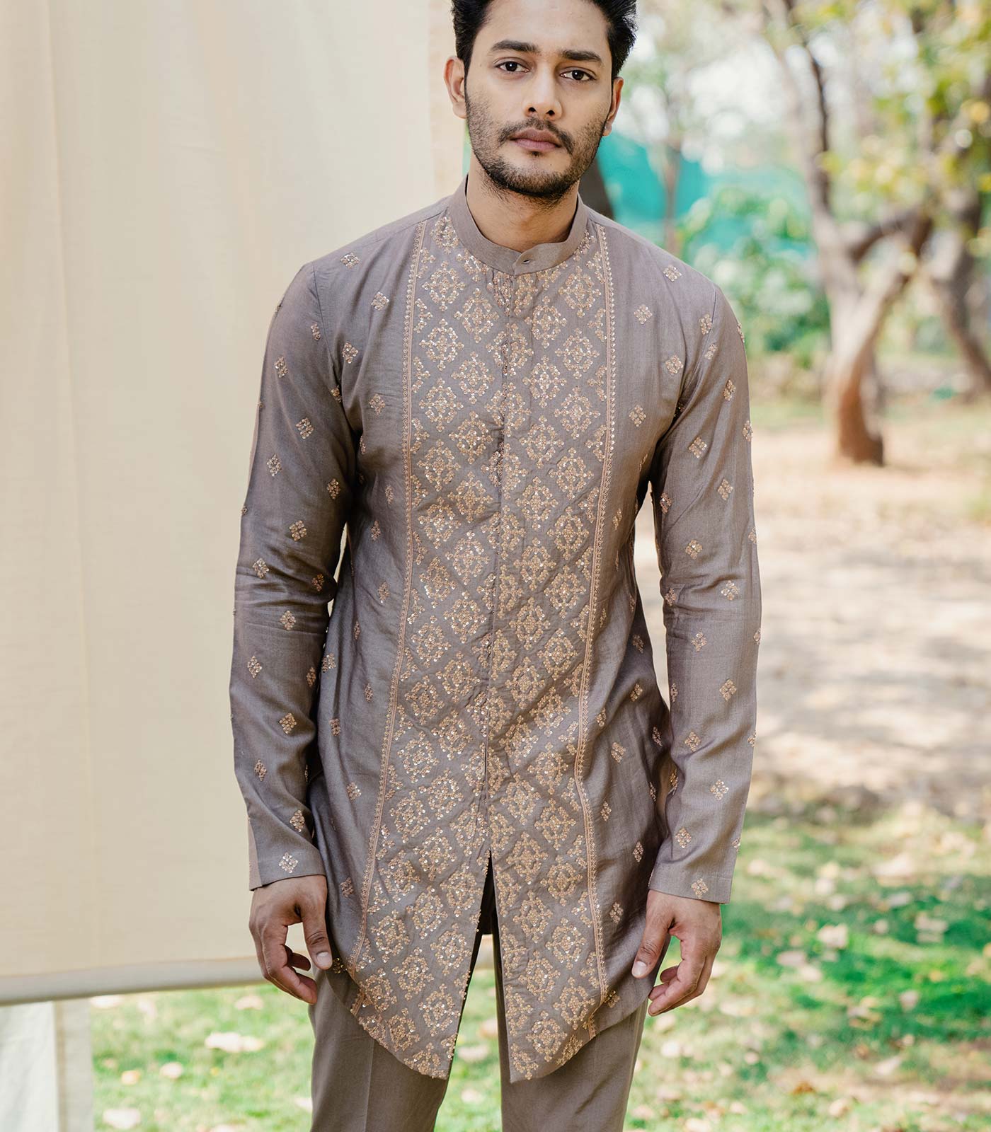 Sandstone tusshar silk full open front conceal placket mid-thigh length kurta with apple cut hem and aari embroidery sandstone tusshar silk trouser