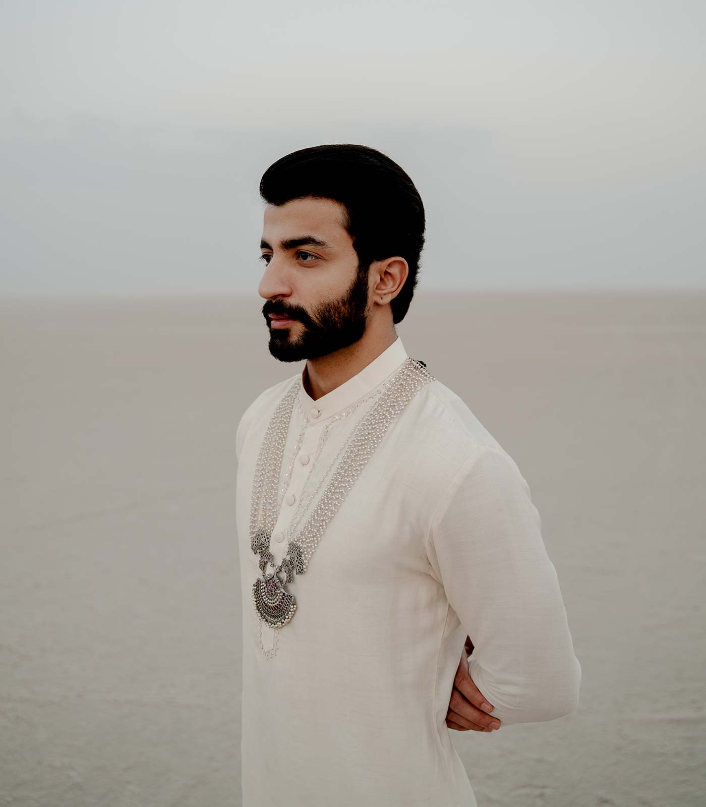 Ivory tusshar silk kurta with aari buta embroidery around collar and placket ivory cotton lycra chudidar bottom