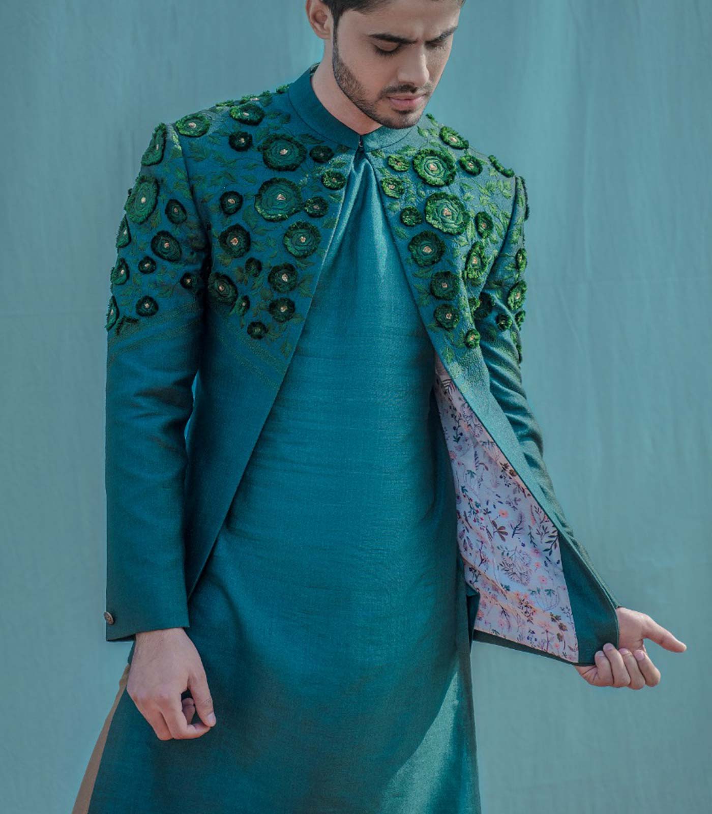 Blue spruce tusshar silk open jacket with floral thread embroidery blue spruce tusshar silk classic straight hem kurta with shoulder zips chocolate italian trouser