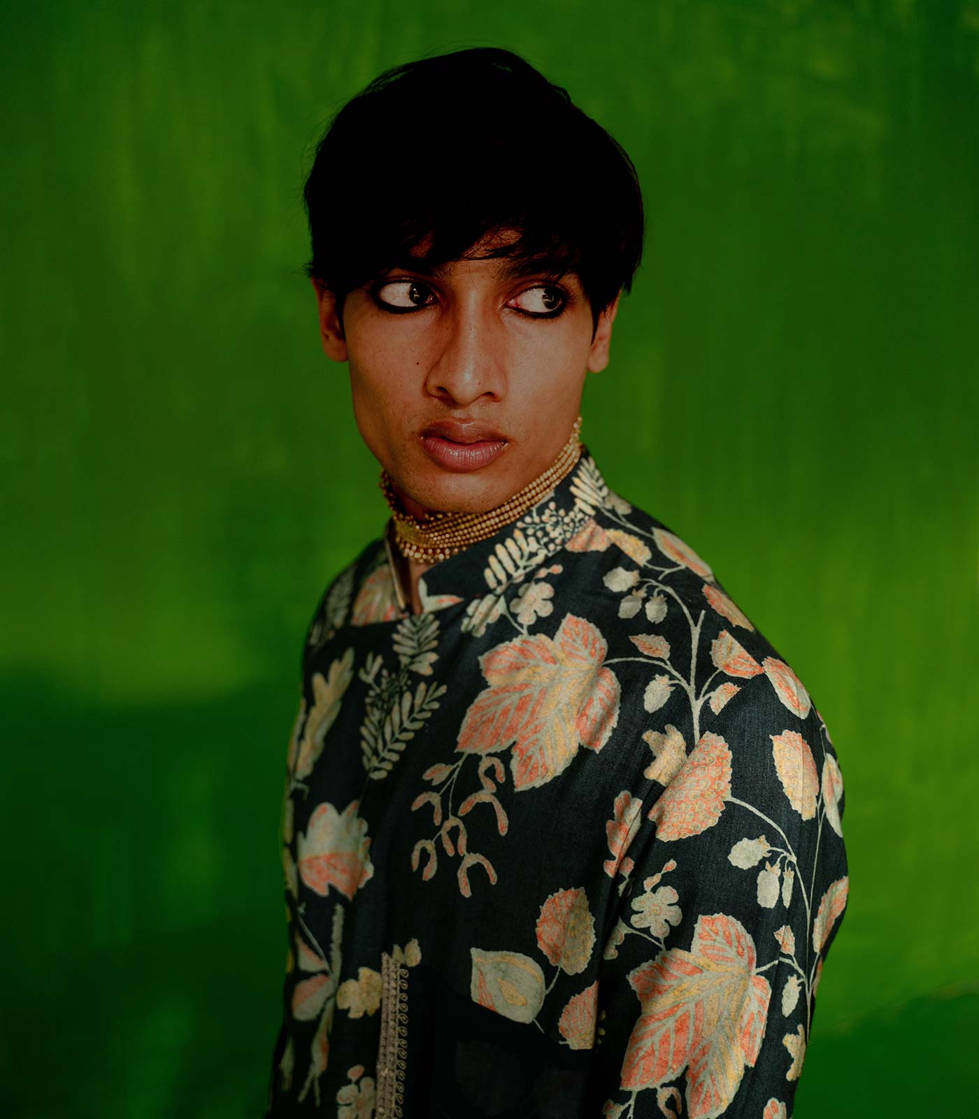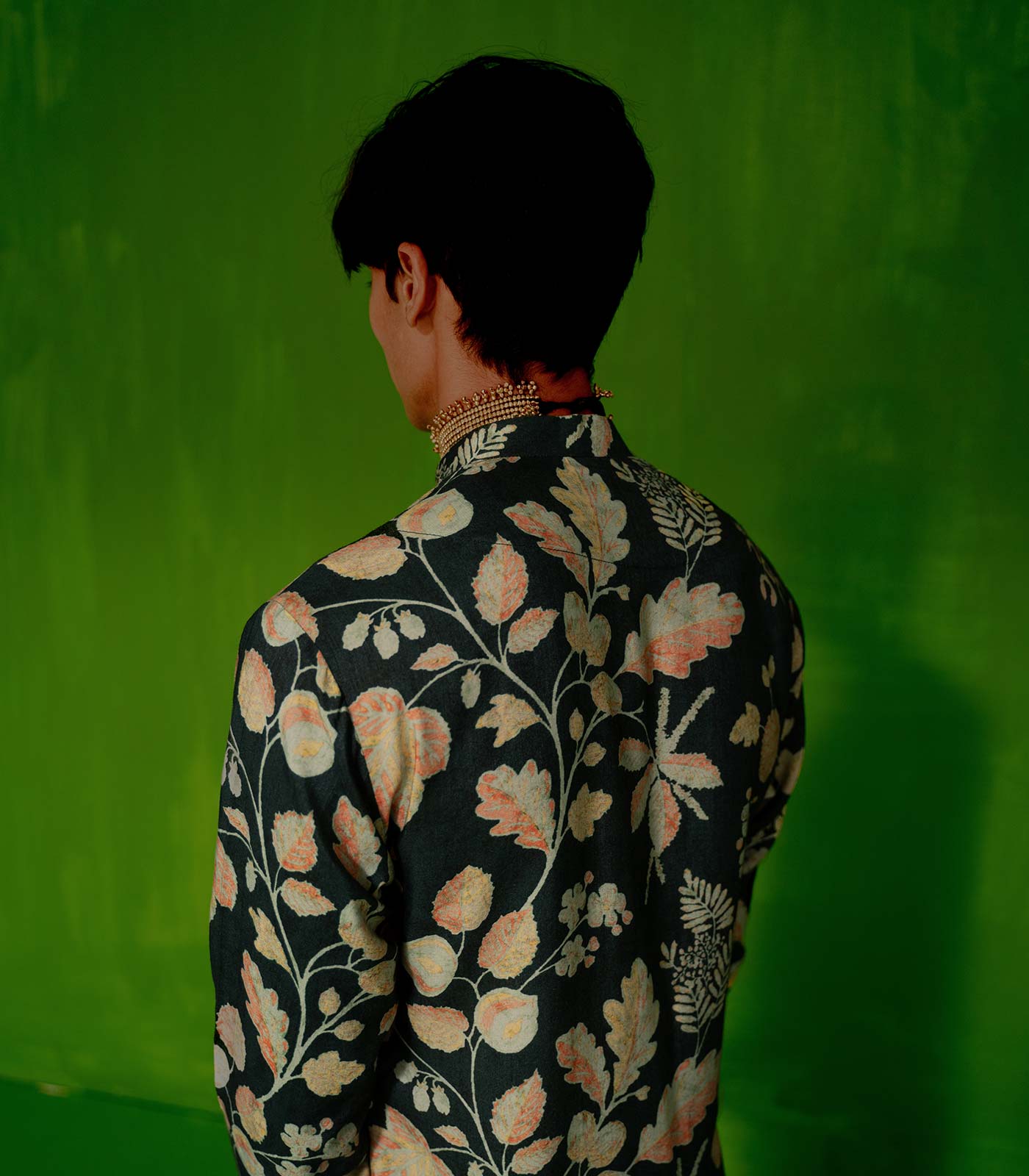 Pine tusshar staple printed full open front conceal placket kurta with mul-cotton dori embroidered side panel pine cotton lycra puna pant