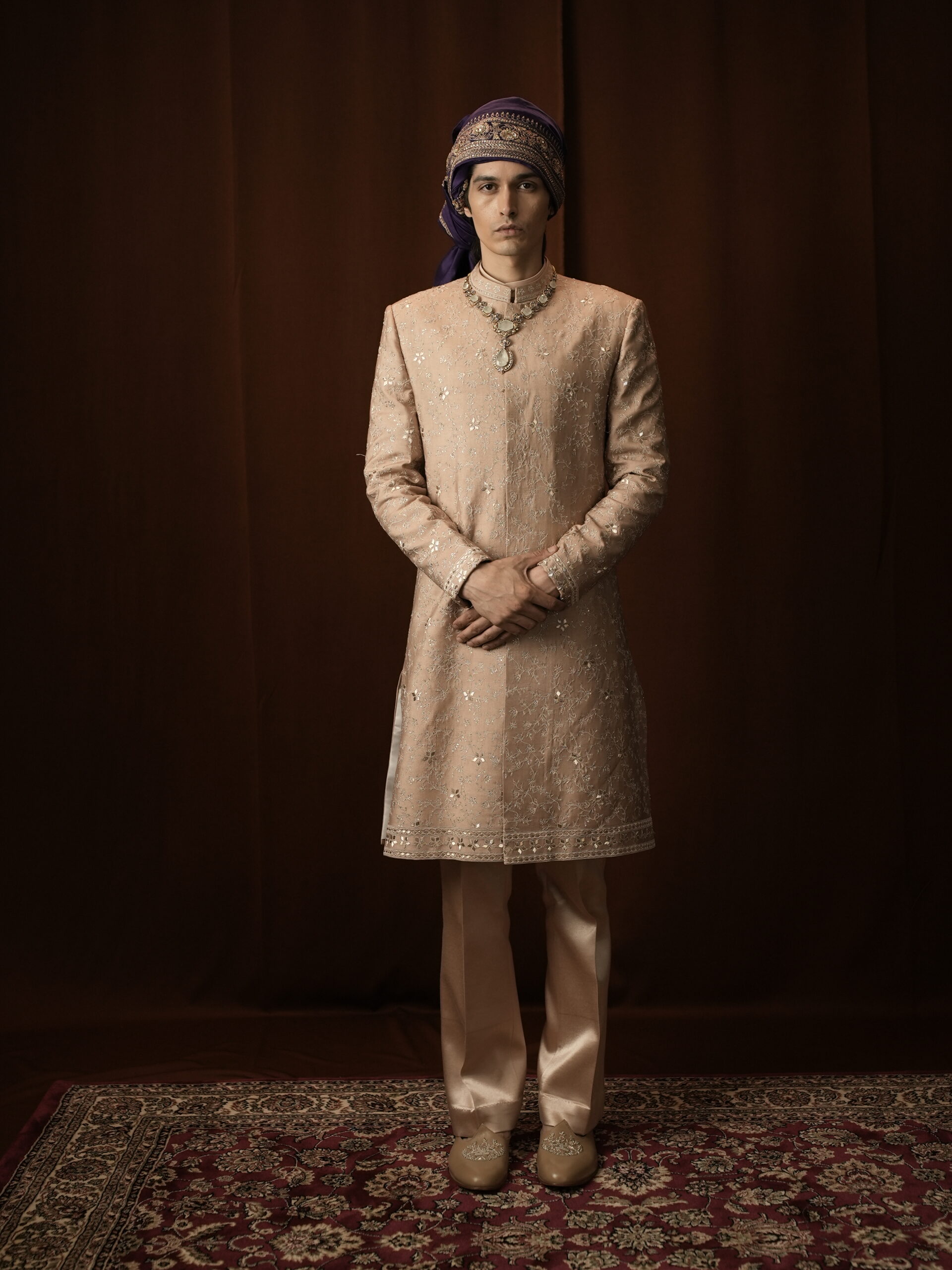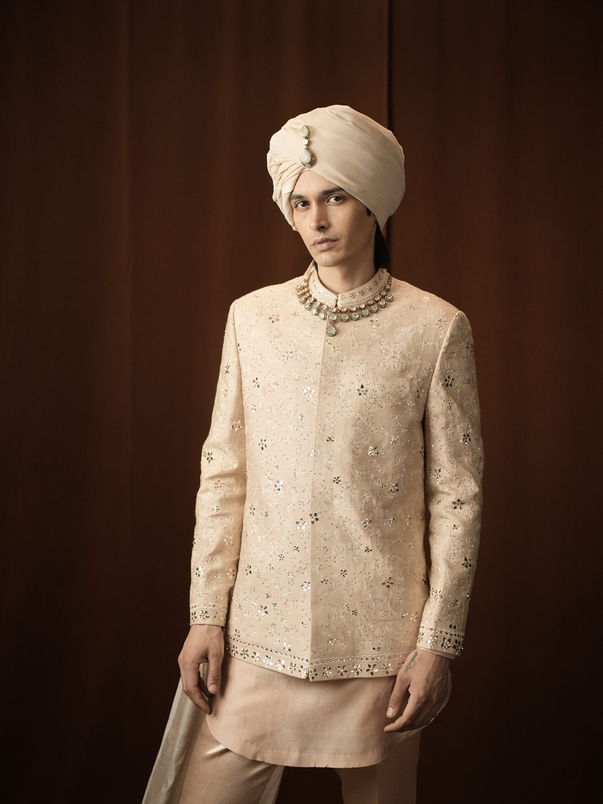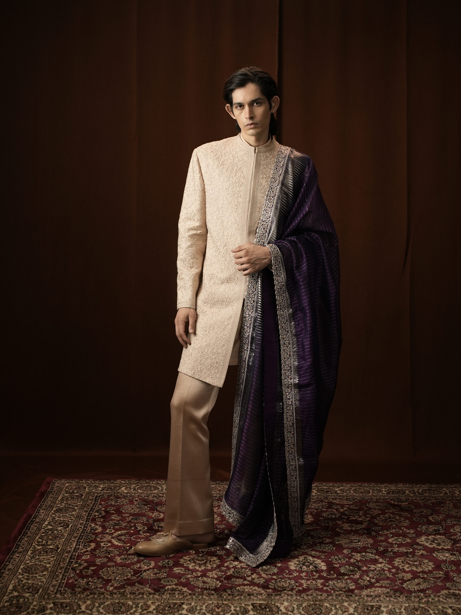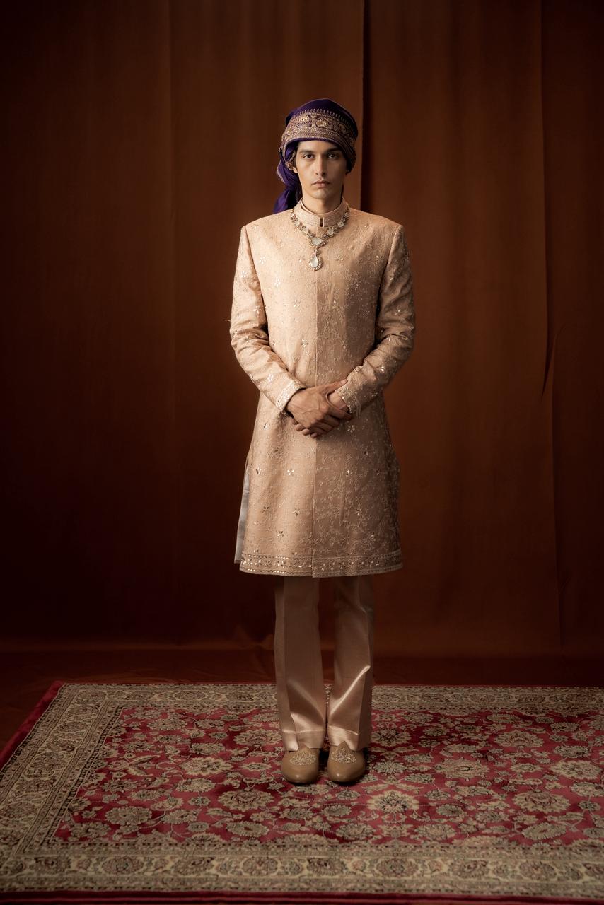 Inspired by The Oberoi UdaivilasThiscouture collection draws inspiration from the opulence and timeless grandeur of The Oberoi Udaivilas—a palace of romance, regal heritage, and architectural marvels nestled on the serene banks of Lake Pichola. Its majestic domes, intricate jaliwork, and frescoed interiors are reimagined through luxurious textiles, hand-embroidered motifs, and a color palette that mirrors the soft golden glow of dawn over Udaipur.Eachensemble captures the soul of royal India—where tradition gracefully meets modernity. Ornate bead embroidery, reshamthreadwork, and delicate gotapattiembellishments echo the palace’s exquisite carvings and lotus-adorned courtyards. Silhouettes are fluid yet structured, weaving narratives of old-world charm with contemporary elegance.Thiscollection is more than couture—it is an immersive journey into a world of quiet luxury, poetic detail, and refined celebration.